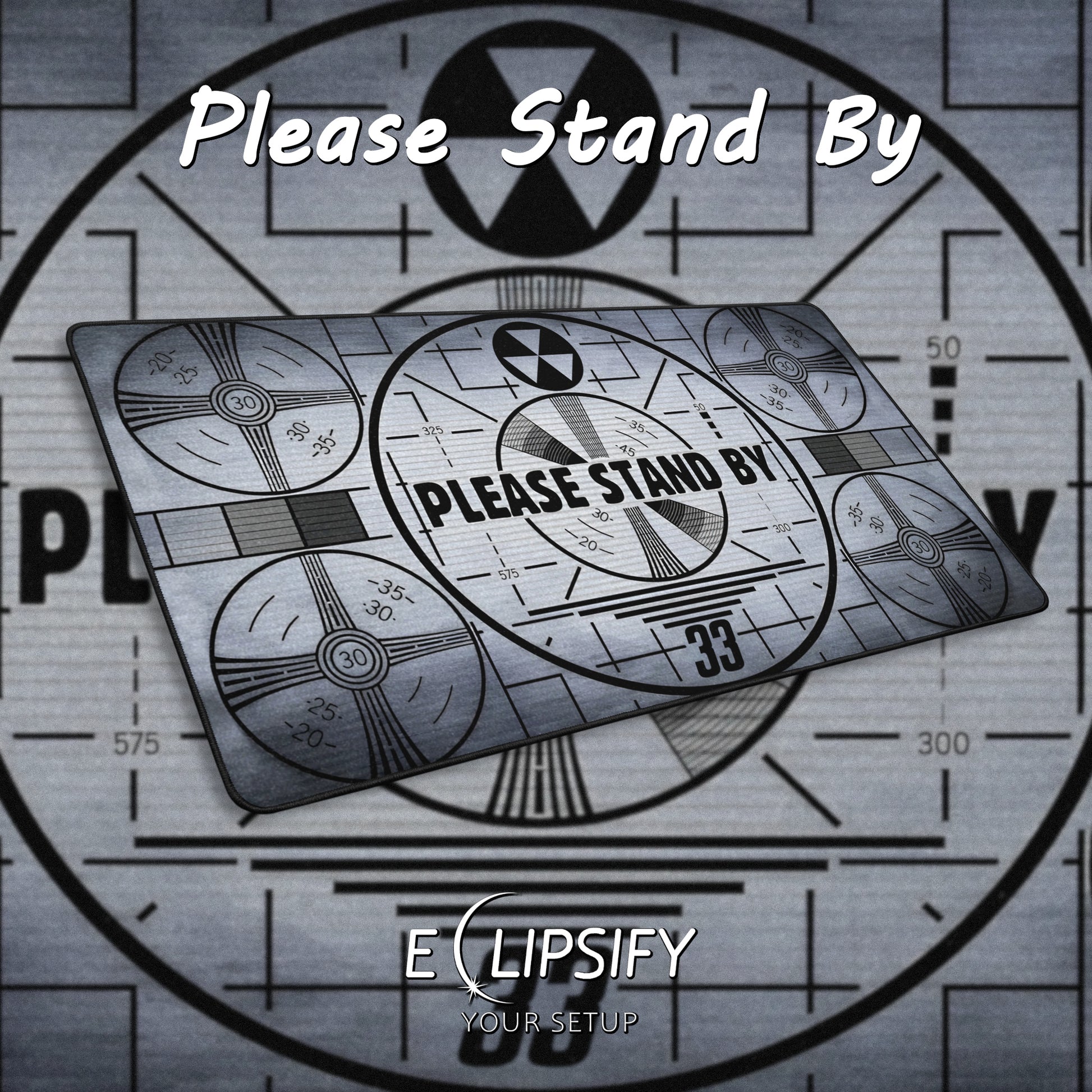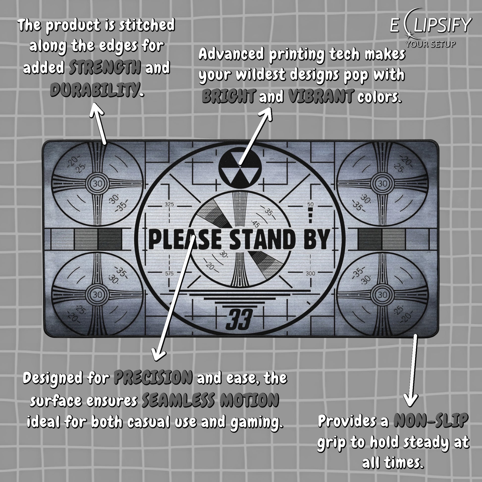 Elevate your PC setup to a professional standard with this large custom Please Stand By: Nuclear Fallou gaming mouse pad. Available in five different sizes: 7" x 9", 12" x 14", 12" x 18", 12" x 22" and 16" x 32" These multifunctional pads can not only just be used for gaming, but as desk mats or play mats.