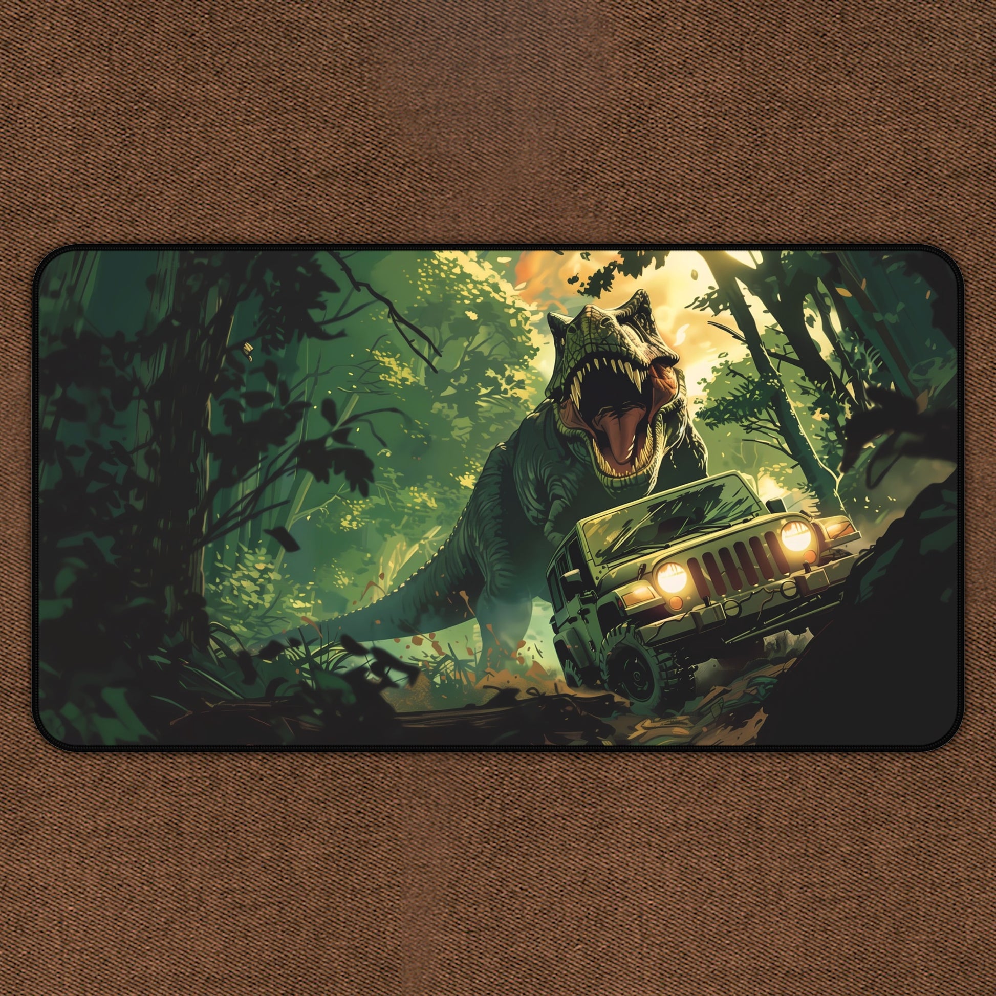 Prehistoric Chase: Dinosaur Chasing Jeep TCG Playmat