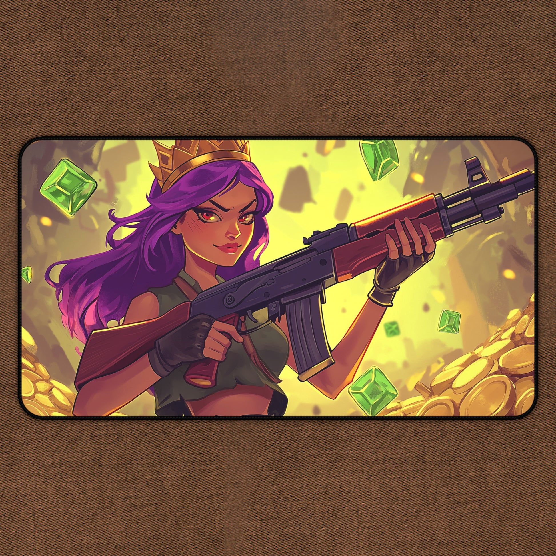 Eclipsify your trading card game experience with your own personal gold treasure queen playmat! Made of 4mm thick neoprene material (smooth and thick), it has an anti-slip backing and a hemmed edge for durability and stability. Available in the standard 14" x 24" and 15.5" x 31" sizes.