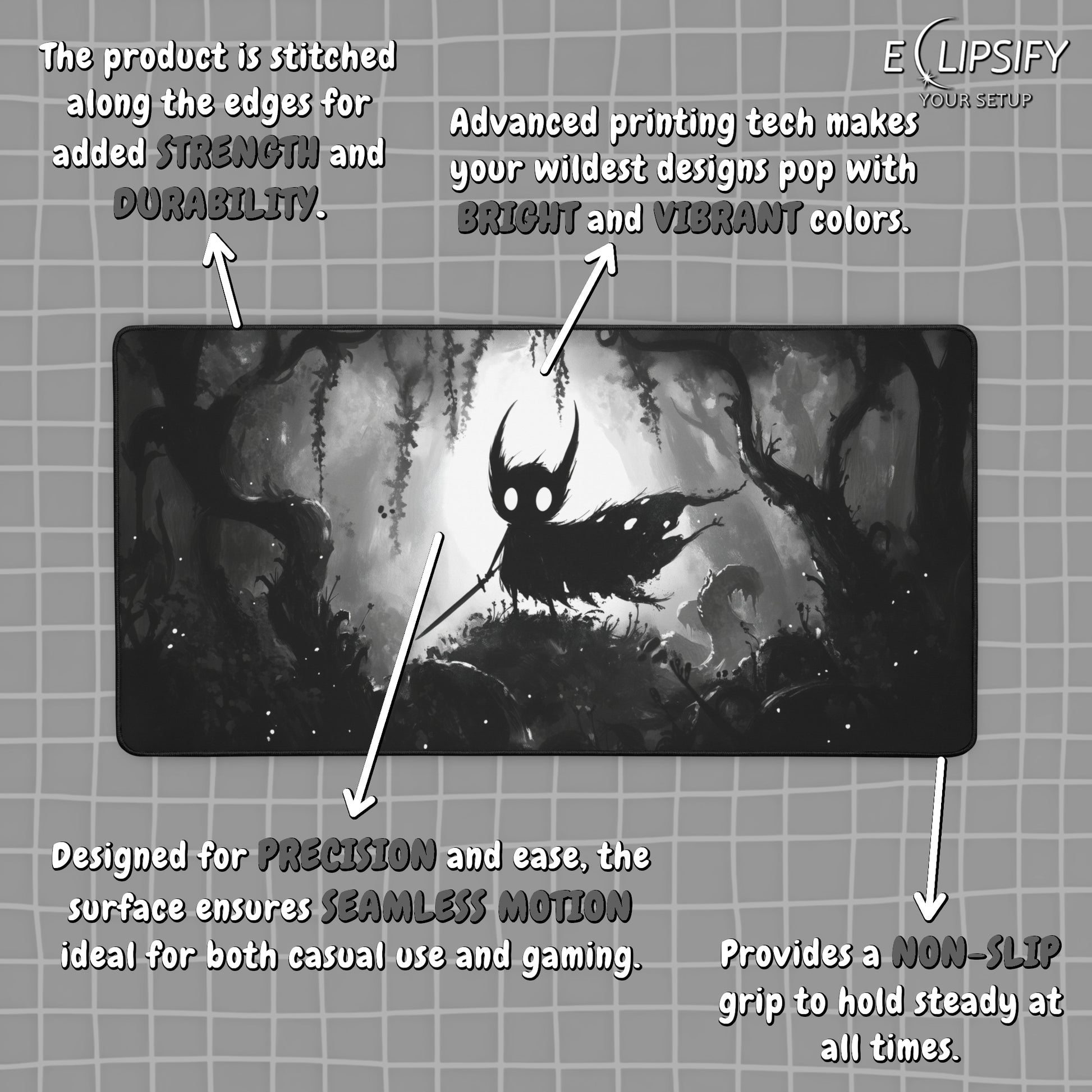 Elevate your PC setup to a professional standard with this large custom The Hollow Guardian: Mythical Knight gaming mouse pad. Available in five different sizes: 7" x 9", 12" x 14", 12" x 18", 12" x 22" and 16" x 32" These multifunctional pads can not only just be used for gaming, but as desk mats or play mats.